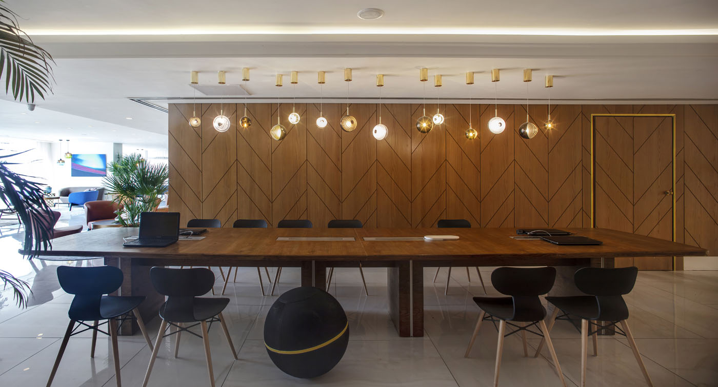 The idea was to make a lighter, less heavy feel to the lobby that is a blend between business and pleasure. Materials such as oak wood, rich fabrics, glass and brass, allow a more formal atmosphere to mix with young and sophisticated, and with the feeling of a luxury vacation.