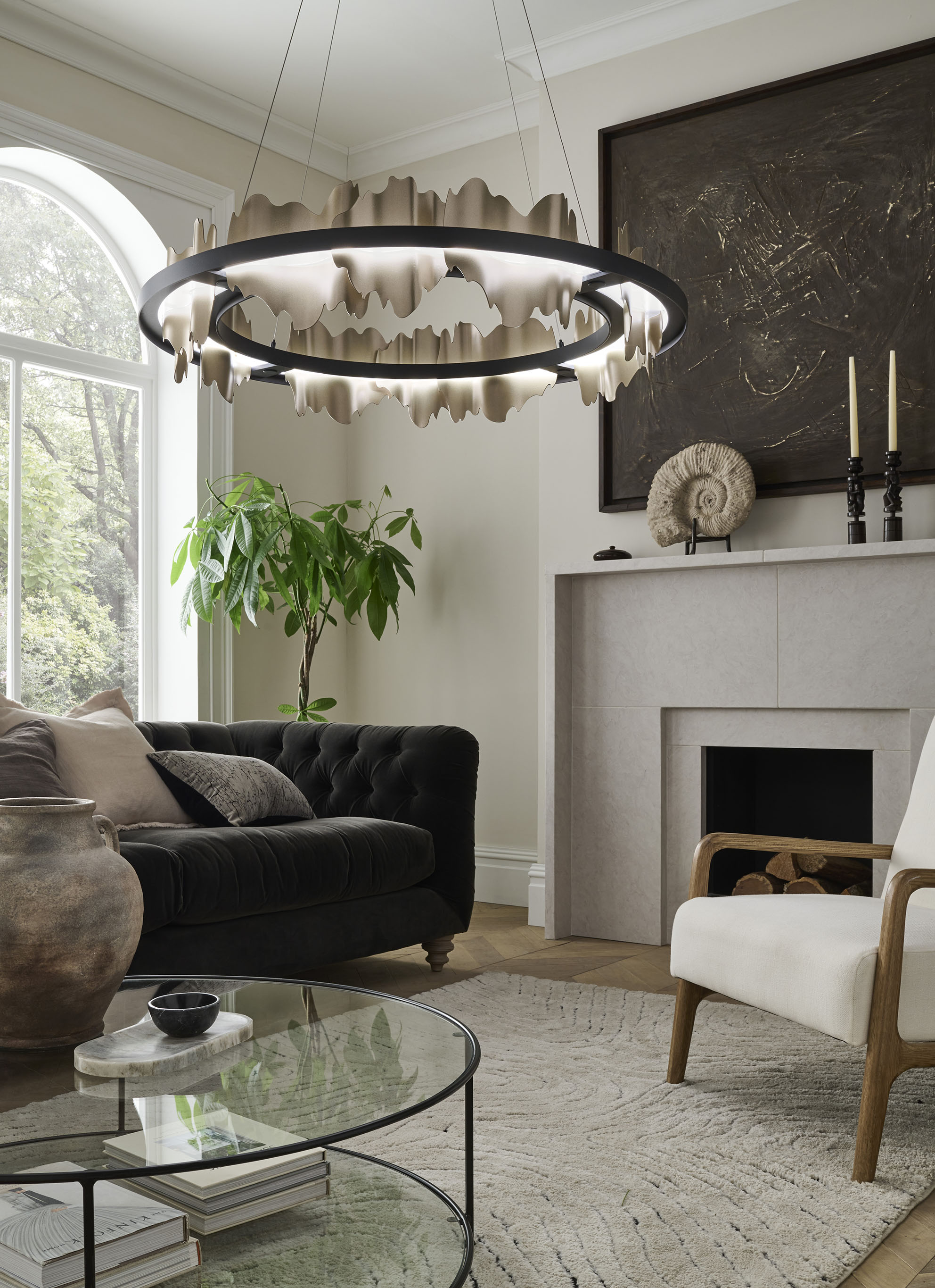 An ultra-modern circular pendant frame encases the discreet LED which illuminates light onto the curved metal plates designed using a forged process. The Ripple pendant is finished in black and soft gold.