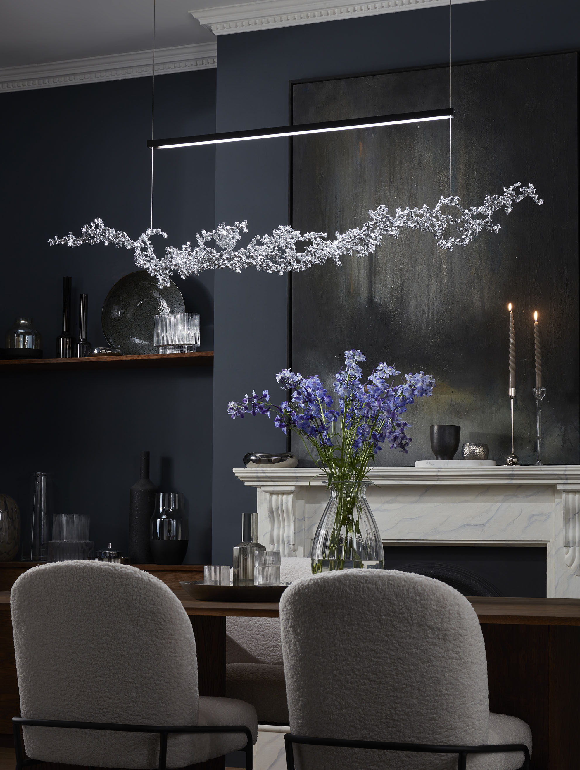 The Blossom is a one-of-a-kind handcrafted pendant made from individual cast aluminium welded in to a free flowing organic shape finished in sterling. This statement pendant is illuminated from above by the LED bar.