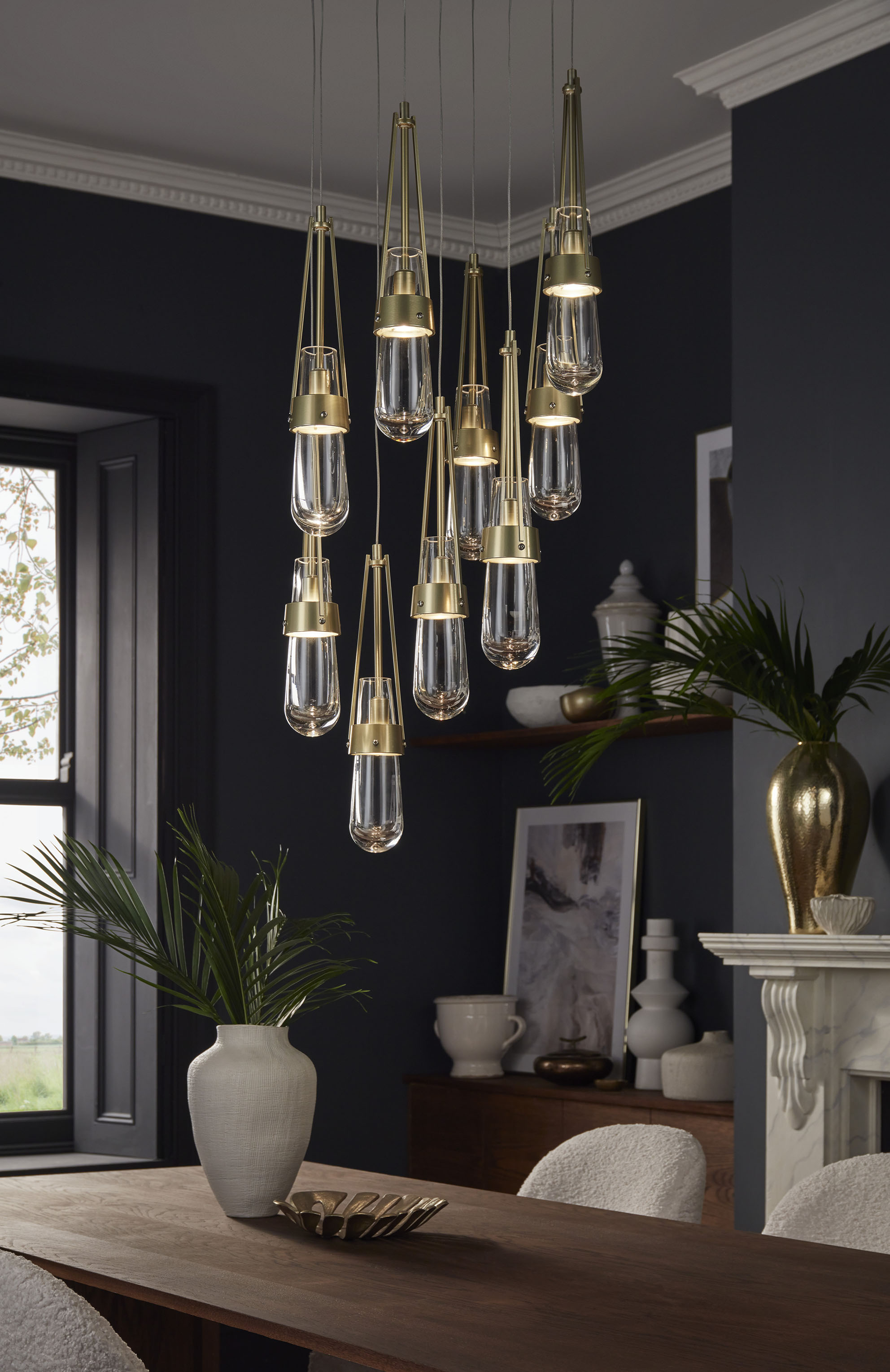 Introducing Rain, a noteworthy staggered nine light pendant cluster finished in modern brass with clear glass shades. Other hand blown glass shade options are available upon request allowing clients to customise this pendant to suit their style and interior.