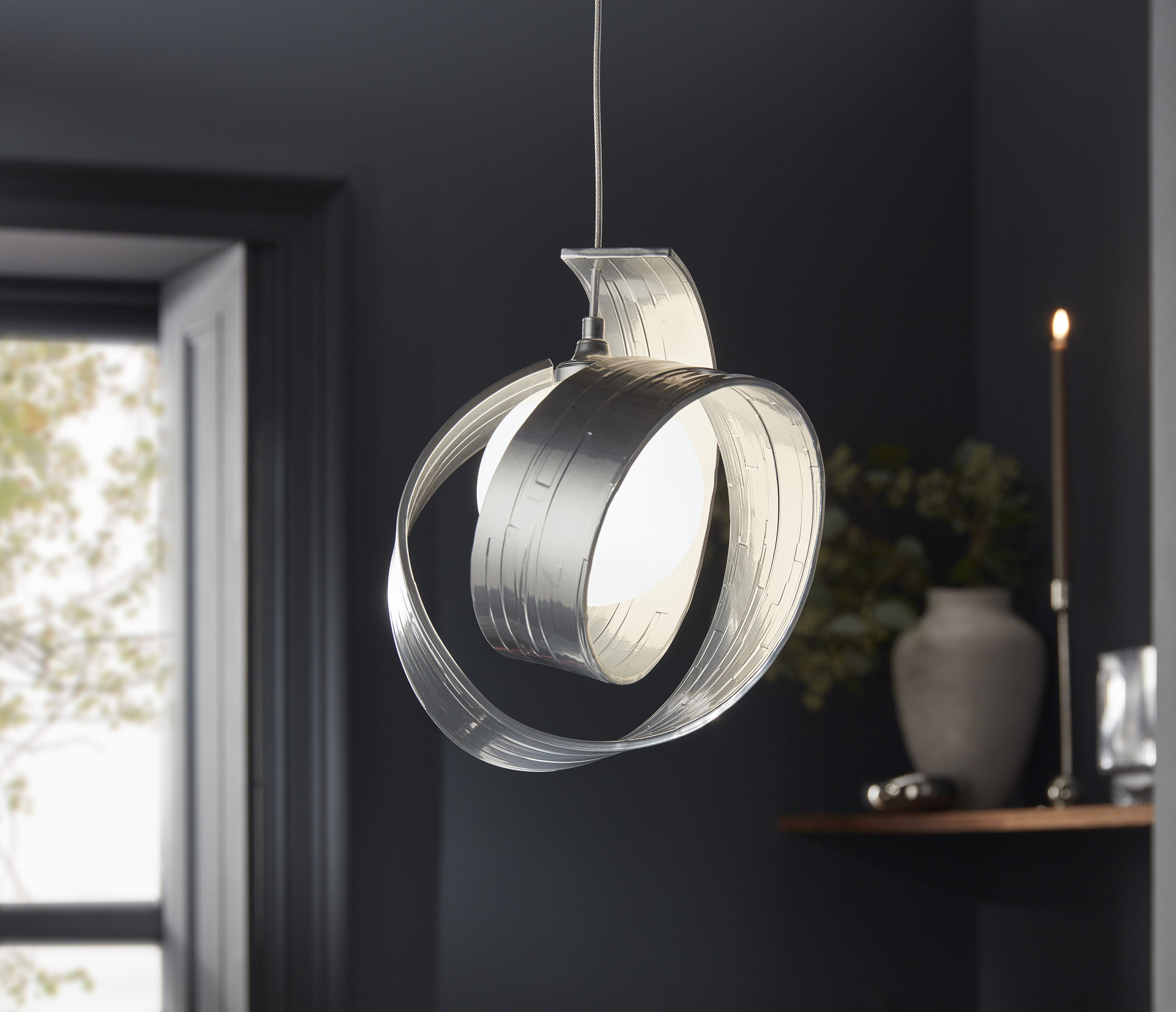 Designed using a forged process to create a curled ribbon effect from aluminium textured metalwork is the Ribbon pendant. This single pendant has an opal glass sphere in the centre and is finished in sterling.