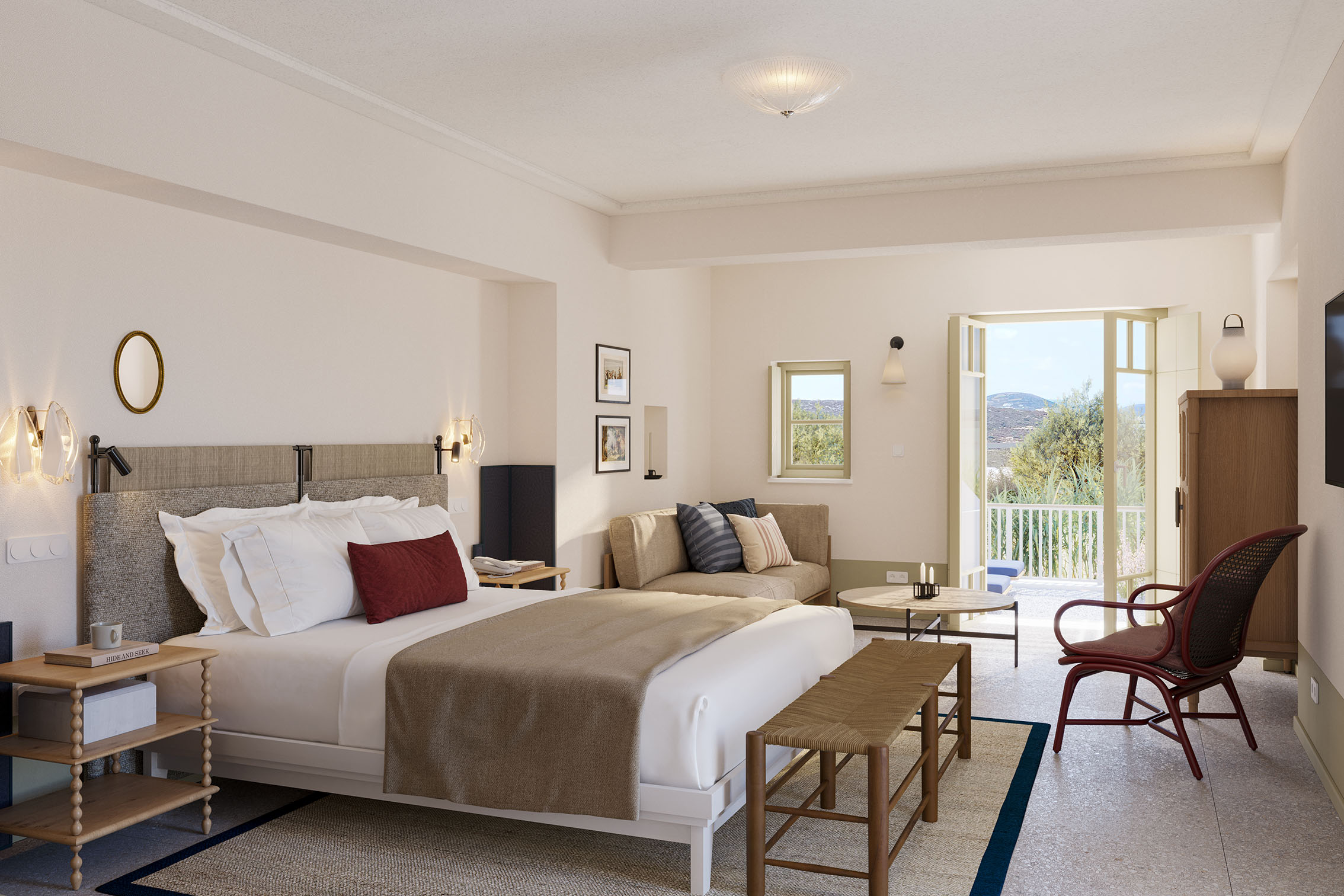 Cosme’s 40 suites envelope guests in a luxurious narrative of Paros, balancing the traditional textures and local stone with carefully curated adornments by contemporary Greek artists, combined with original gravures of Paros’ folk life and naval tradition. Art at Cosme is as integral as the feeling of the sea and local cues in the architecture, with an eclectic mix of native multimedia artists such as Margarita Myrogianni, Naked Summers, and Terpsichori on display throughout the hotel.