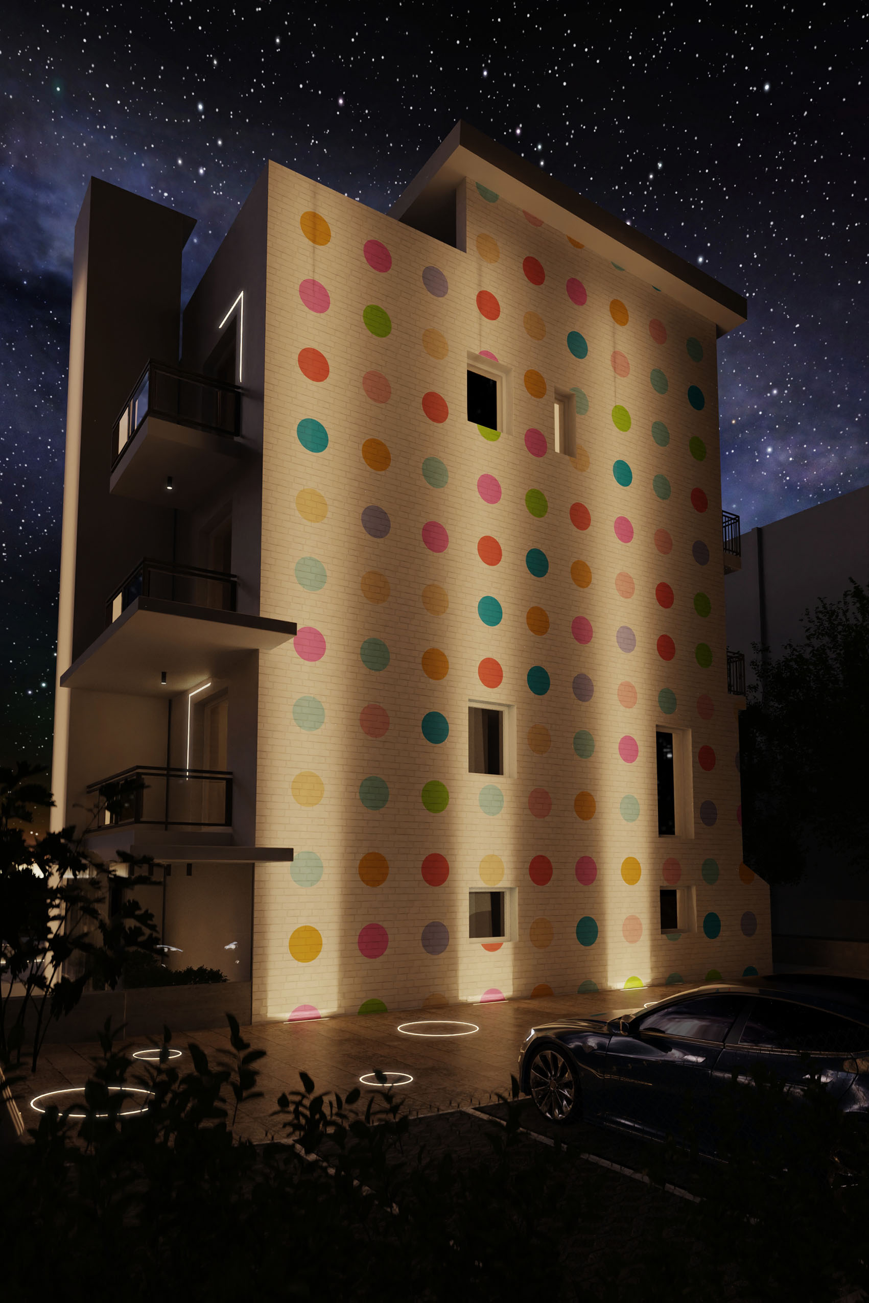 The exteriors and the common areas identified by the incipit of a famous Italian song Cerco l'estate tutto l'anno ("I'm looking for summer all year round"), are designed by CaberlonCaroppi studio, which has created a concept inspired by colour, with each floor characterized by a different shade. The inspiration is industrial "with a reference to the new creative hubs and to the dynamic business and co-working environments but revisited with a very strong Pop and Deco note". Stunning exterior solutions with colourful glass balconies and a stunning wall wallpaper outdoor which reflects the pattern of bricks and outsized dots. "Building among buildings, it aims to be a landmark."