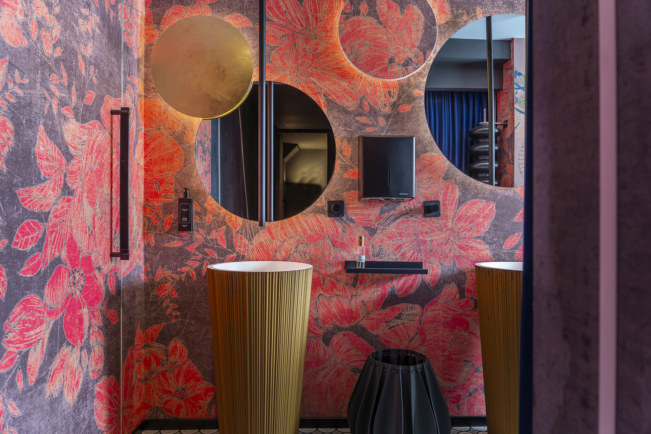 On the ground floor, the visiting card of every public space: the restroom. Poetically named Drama, it was designed by Laura Verdi, who wanted to dedicate the room to the heroines of Italian operas - a tribute to Verdi and Puccini - each evoked by a different theme on the walls covered in wallpaper. "The bathrooms are accessed through a corridor. I transformed this place of passage into an experiential moment, made of darkness and light cuts: a prelude to a scenario that will surprise open behind a theatrical curtain." And just like in the theatre, you go on stage with a specially designed playlist that repeats in loop the most famous arias of the selected works while you are reflected in a magic mirror that transmits emotional and evocative images. And everything is designed to enhance femininity, from designer furniture thermostats to free-standing washstands.