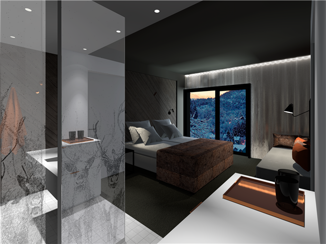 Working with architect Pave Mikkonen the new hotel will offer a genuine experience of Arctic art and design. The ’hip’ roof blends into the fell highland landscape with the exterior built of greying Lapland pinewood and a reception area of natural stone. The colours and materials used will include locally sourced wood, natural stone and copper.