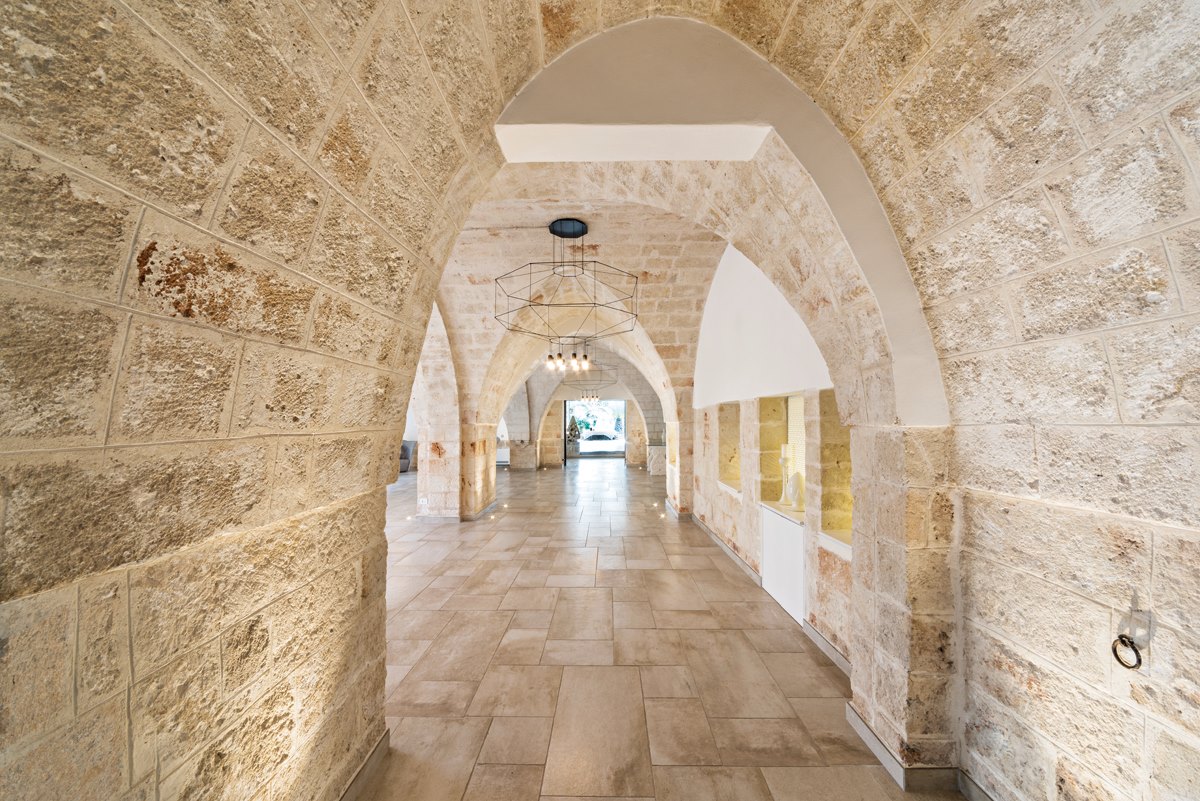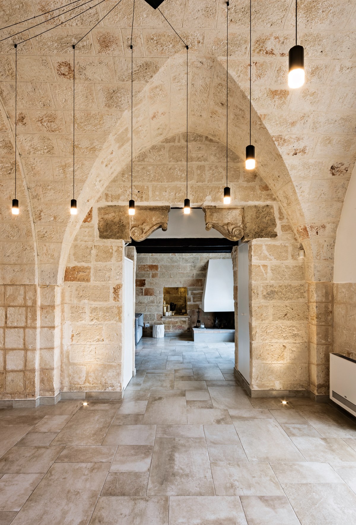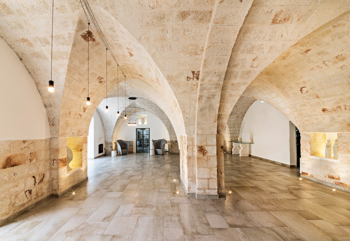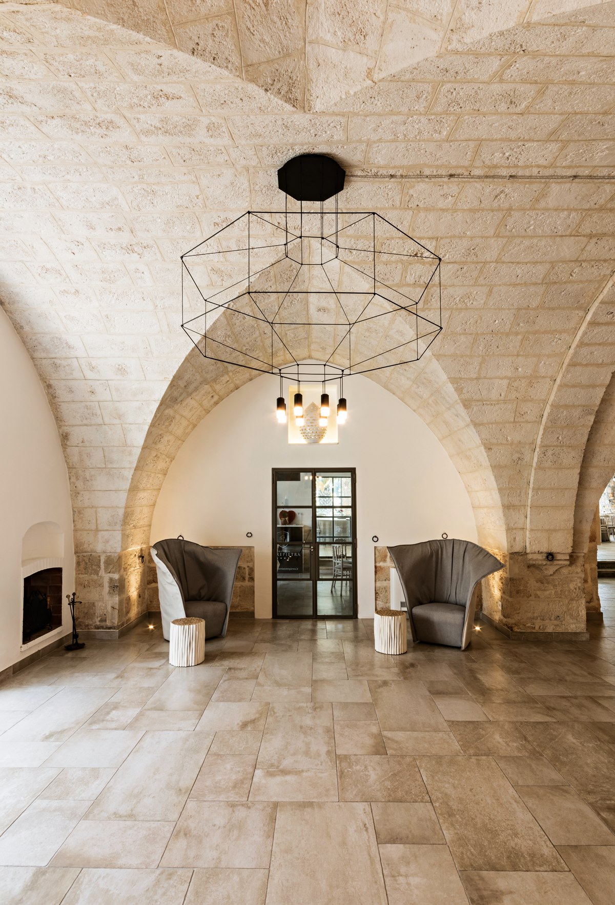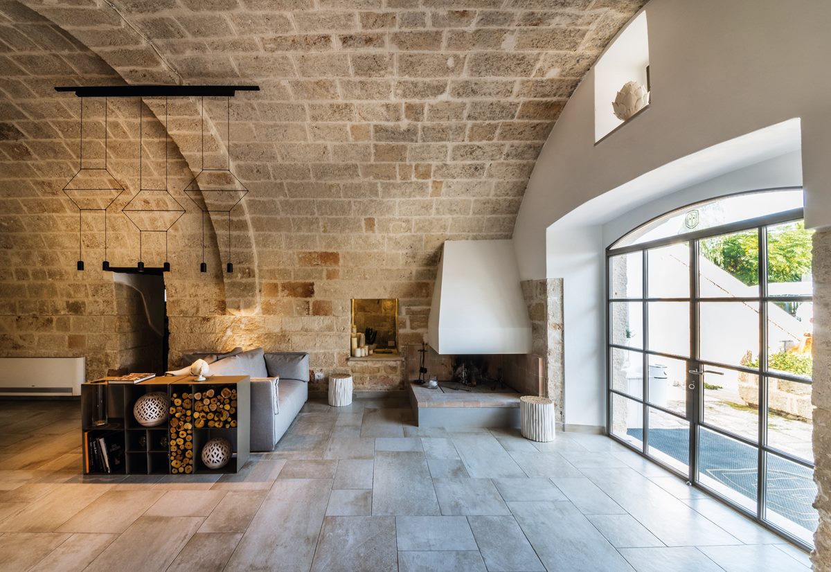Local firm M + T Architetti designed the hotel, which is also used for weddings and events. They retained many of the 19th-century structure’s original materials, such as stone walls and arches and Italian tile adorning floors and bathrooms. The interiors are streamlined and uncluttered, featuring contemporary furnishings and lighting by Vibia.