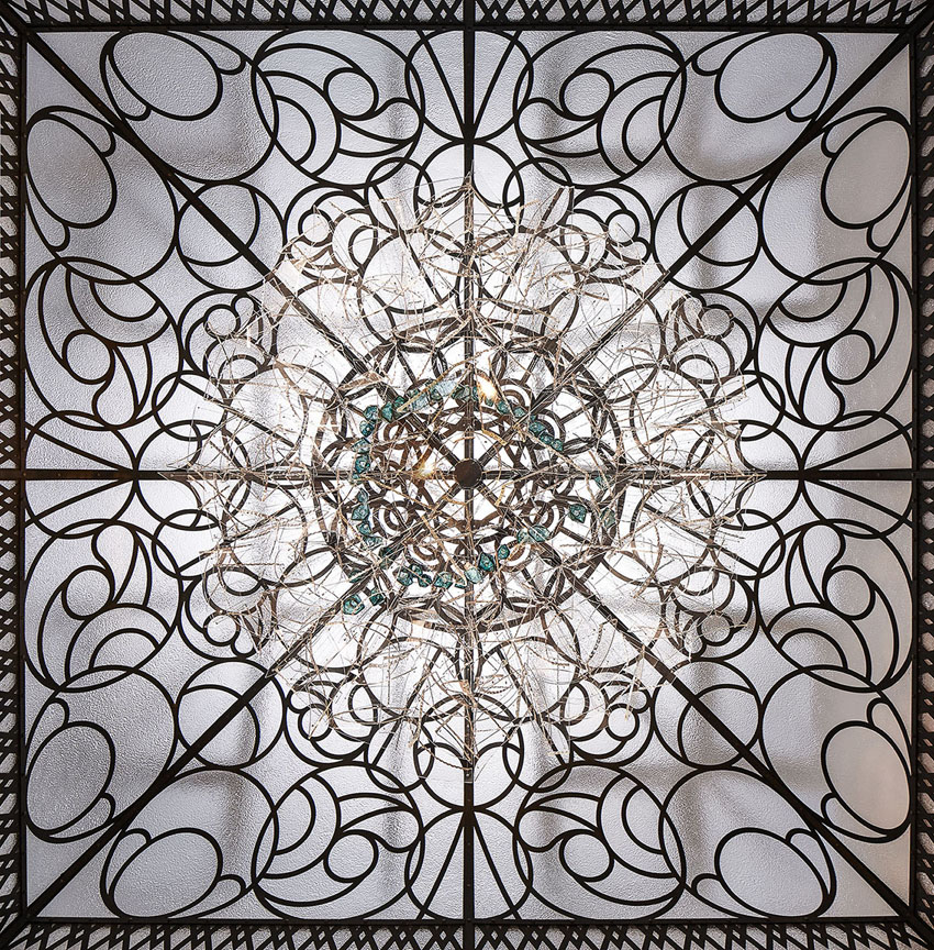 Hidden behind secret doors disguised in bookshelves is a portal to Sibín, Great Scotland Yard’s lucrative whiskey club. Whiskey-filled display cabinets sculpt the club into three spaces, rolling along the copper-leafed distressed wood floors, whilst a bar sits at the epicentre beneath a ceiling feature made of 1,935 bottles. The bar and lounge, The 40 Elephants, is named for the 19th and 20th century all-female London crime syndicate known for its longevity and skill in dodging police detection. A stunning glass chandelier composed of a series of broken glass pays tribute to the way the female gangsters would break into London-area stores. Buried in the centre of the installation is a jewel-tone necklace representing the members of the Forty Elephants gang. HBA designers further conveyed the spirit of the thieves through glass-engraved portraits hanging high on the walls.