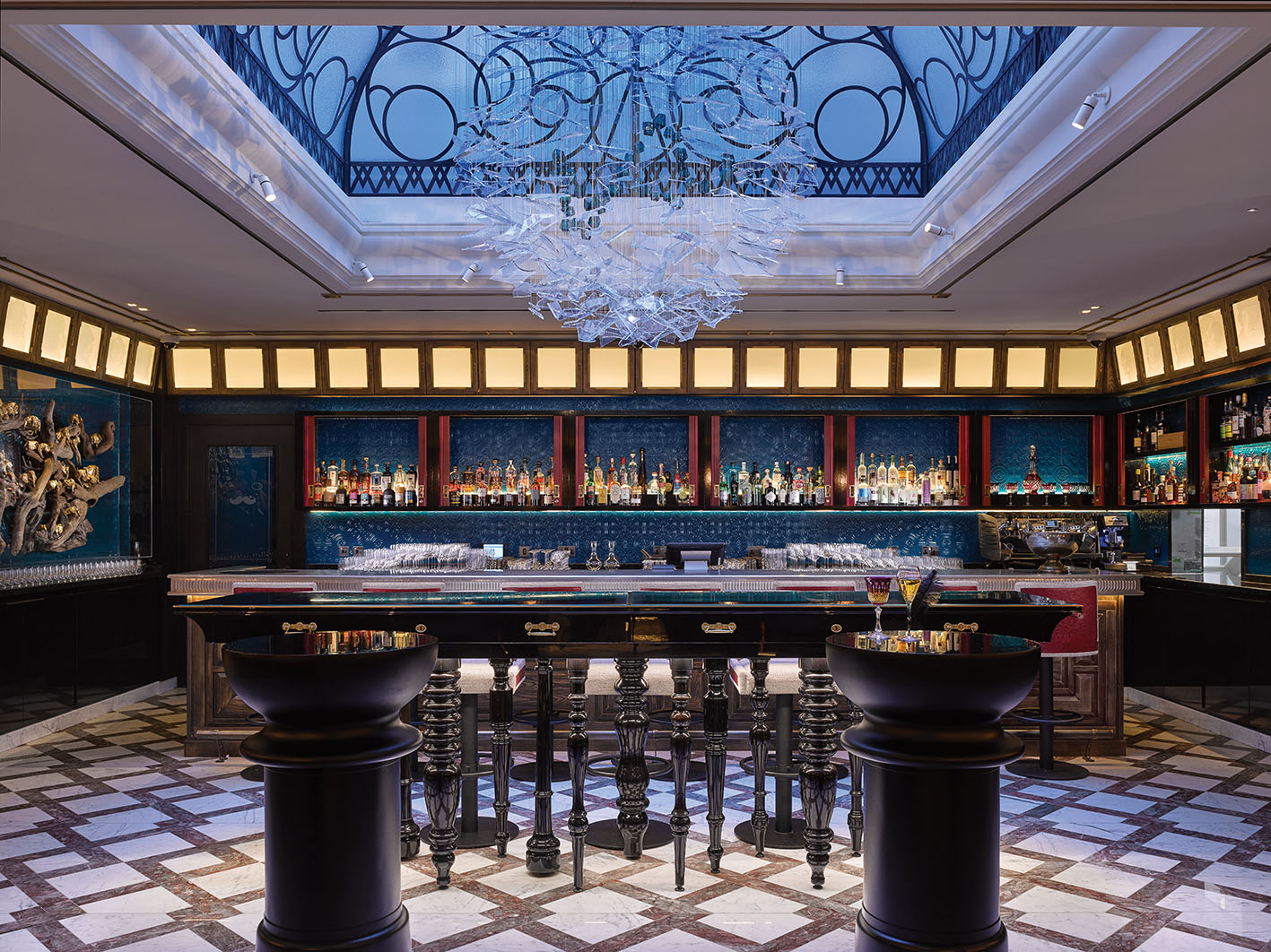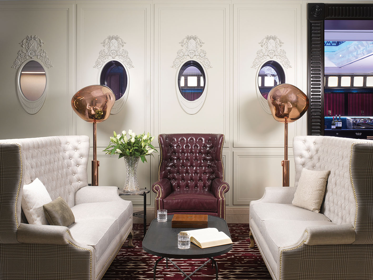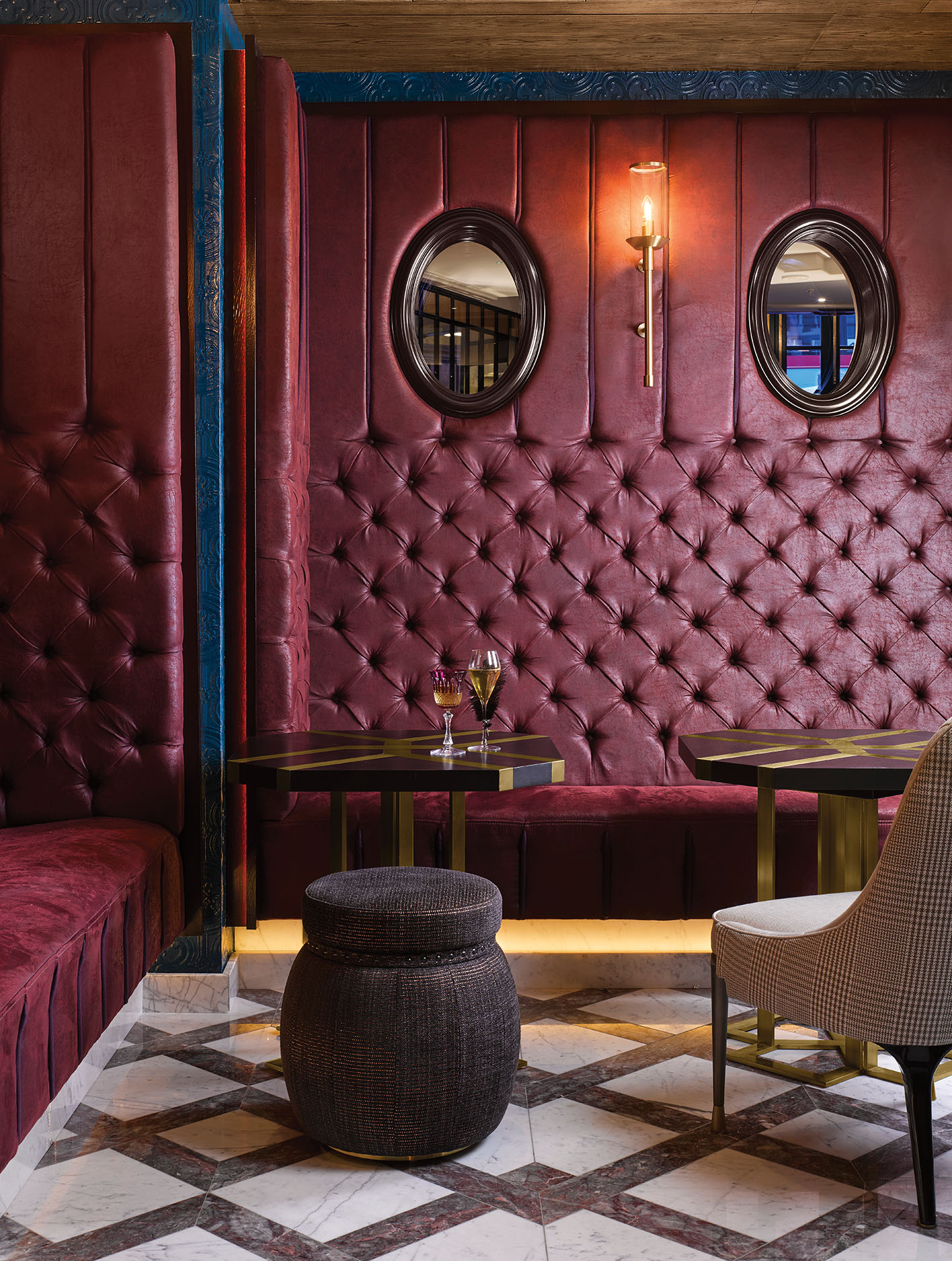 The Yard, a modern British restaurant, transports guests to a comfortable countryside escape with barrelled ceilings, vintage lamps and millwork from Northern Ireland. Inspired by The Imperial hotel in Delhi, The Parlour is a warm setting for afternoon tea or cocktails with its classic colonial feel, black-and-white chequered flooring and oversized fireplace.