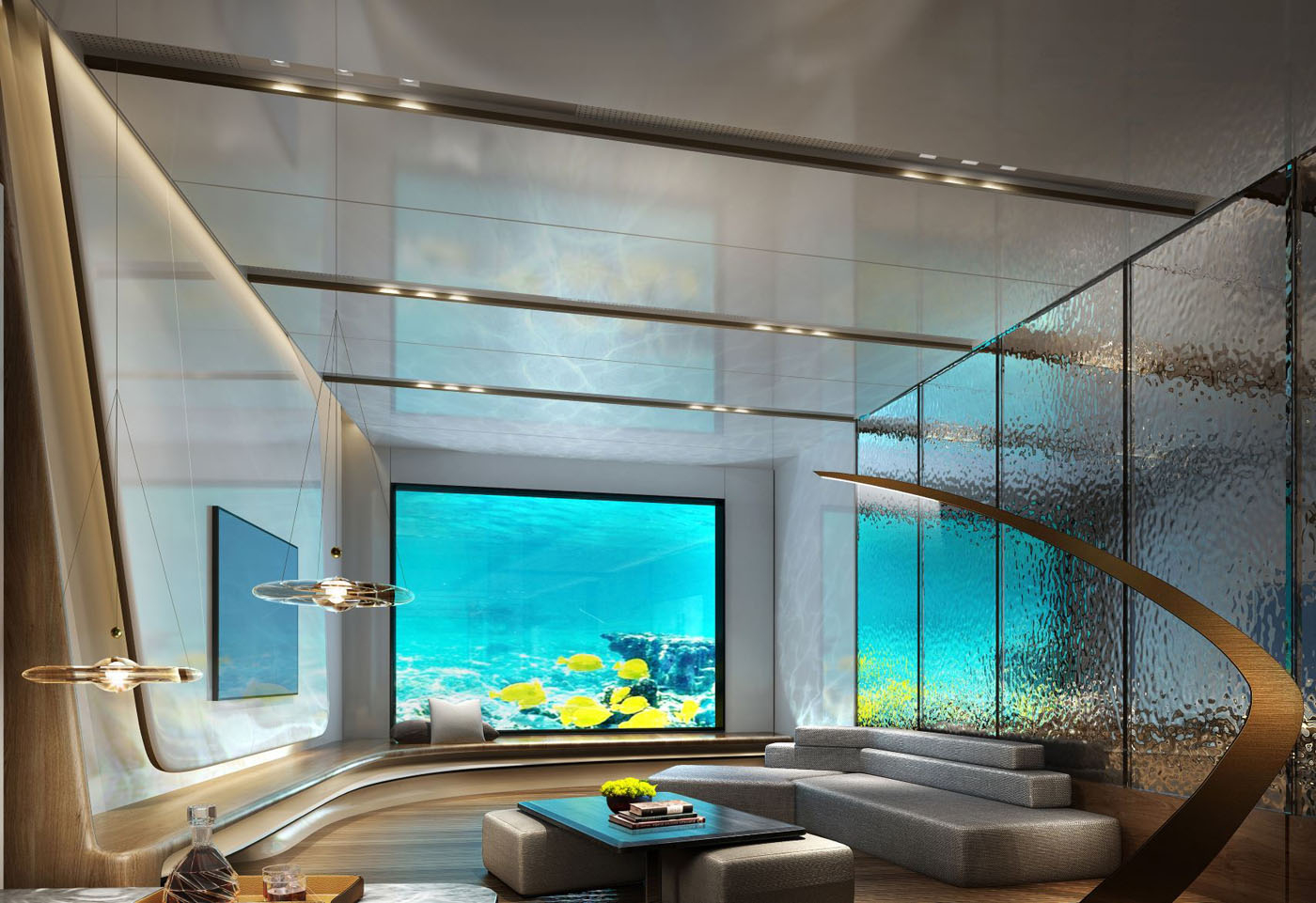 The hotel also has six underwater suites, which offer two levels: the landing deck at water level houses the outdoor terrace and living room, whilst the underwater level features a bedroom encased within a turquoise aquarium.