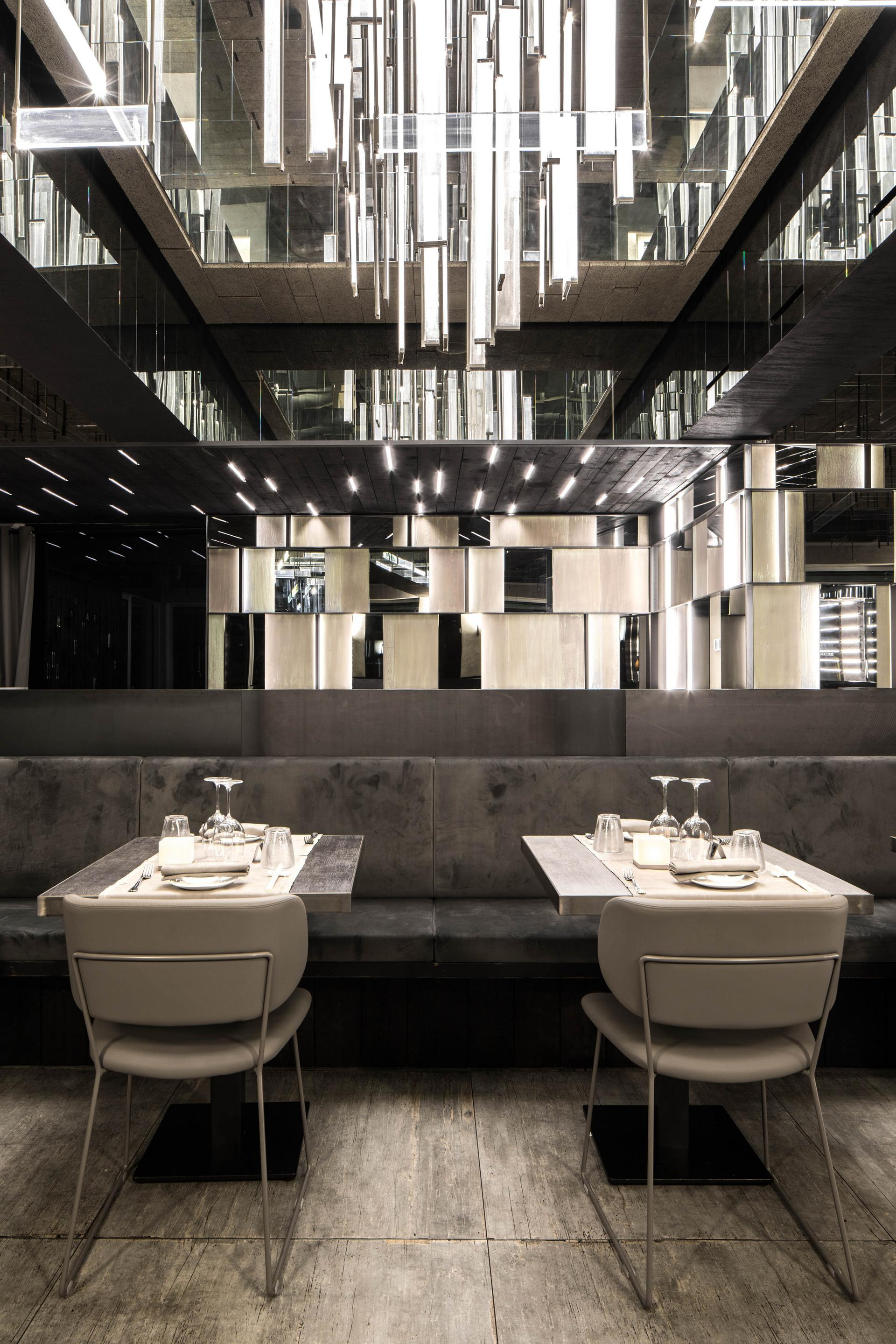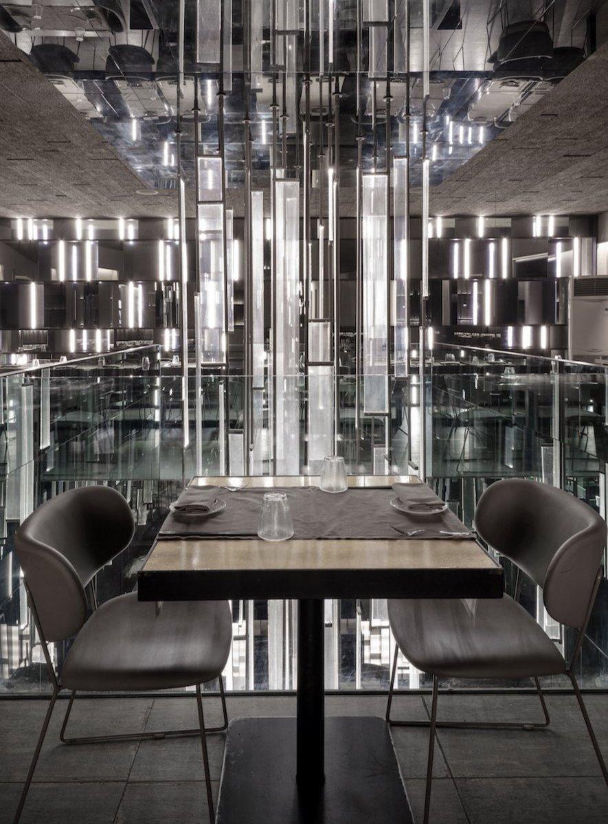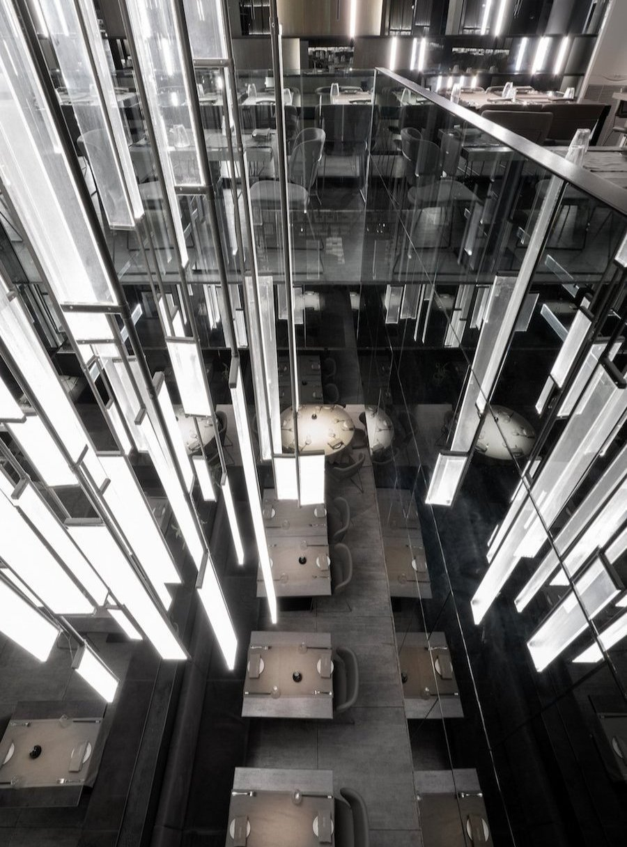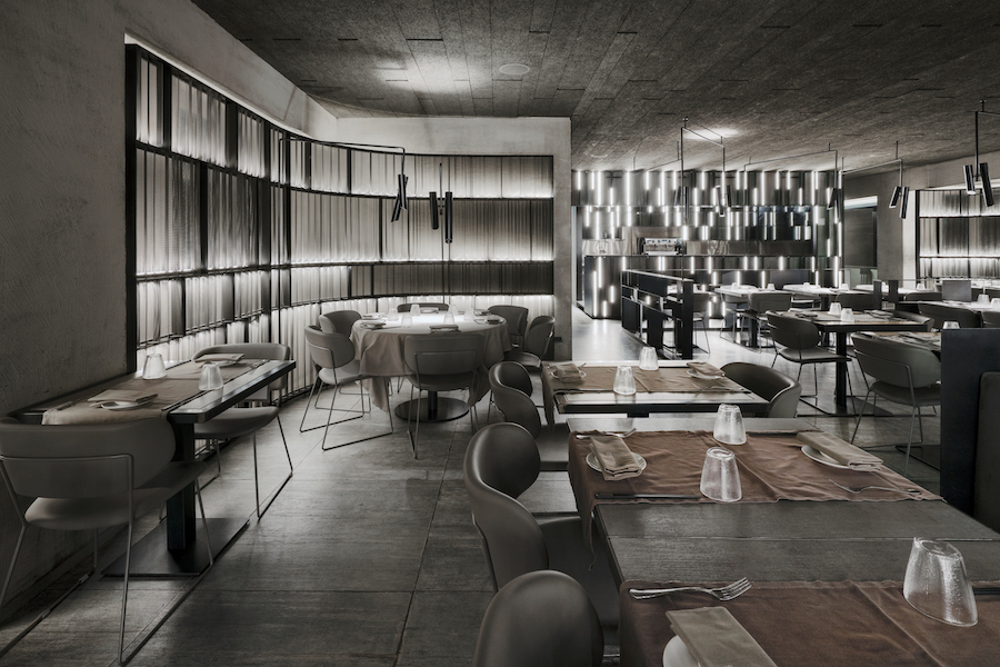 The restaurant is spread over an area of about 1000 square meters, distributed on two levels. The interiors are characterized by a chromatic continuity that favours warm and dark tones, in contrast to the scenic use of light. On the vertical surfaces, luminous inserts define a precise metric, increased by the ceiling installations and further amplified by the wall mirrors of the main room. The dark / light dichotomy is resolved in elegant, welcoming and refined environments.