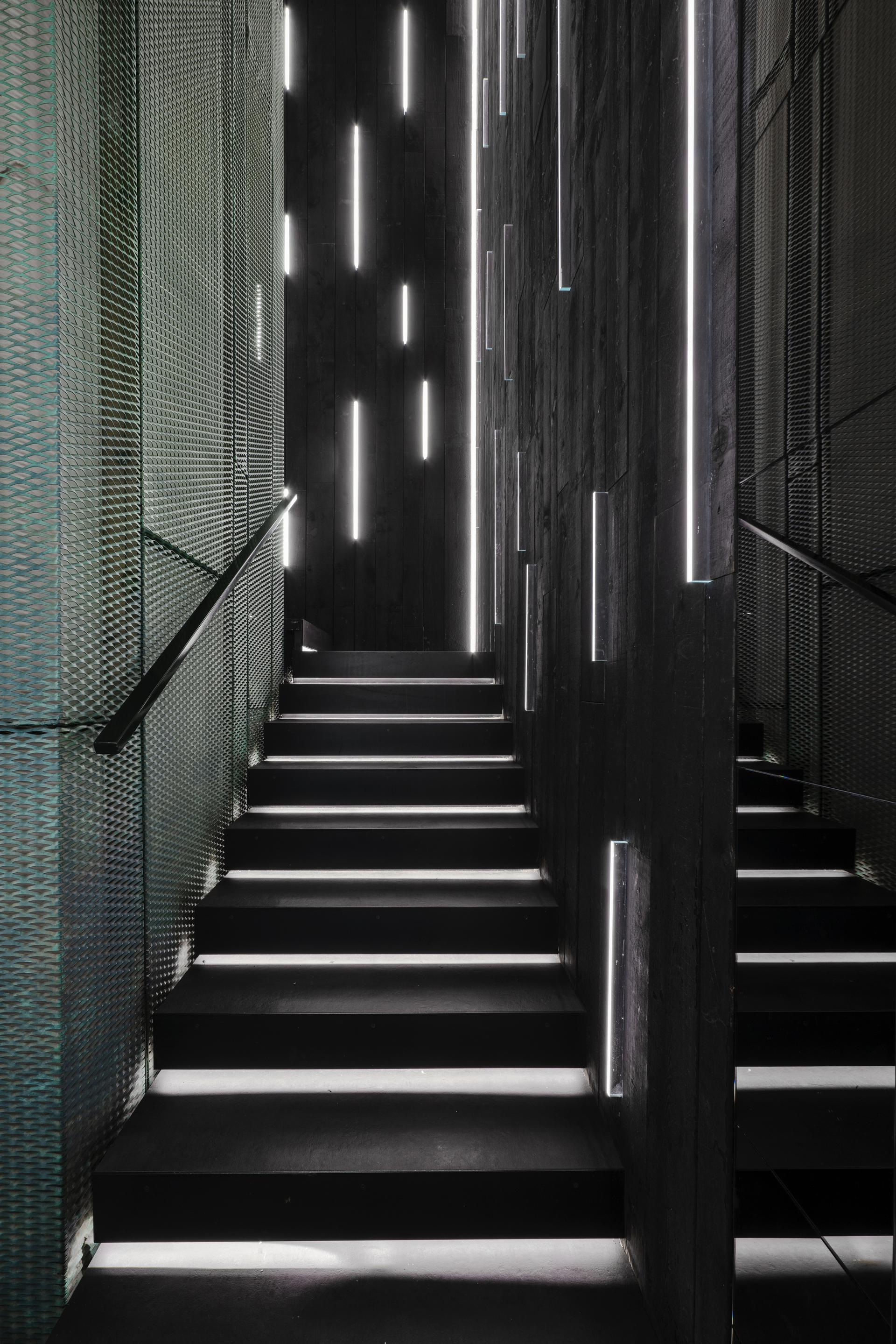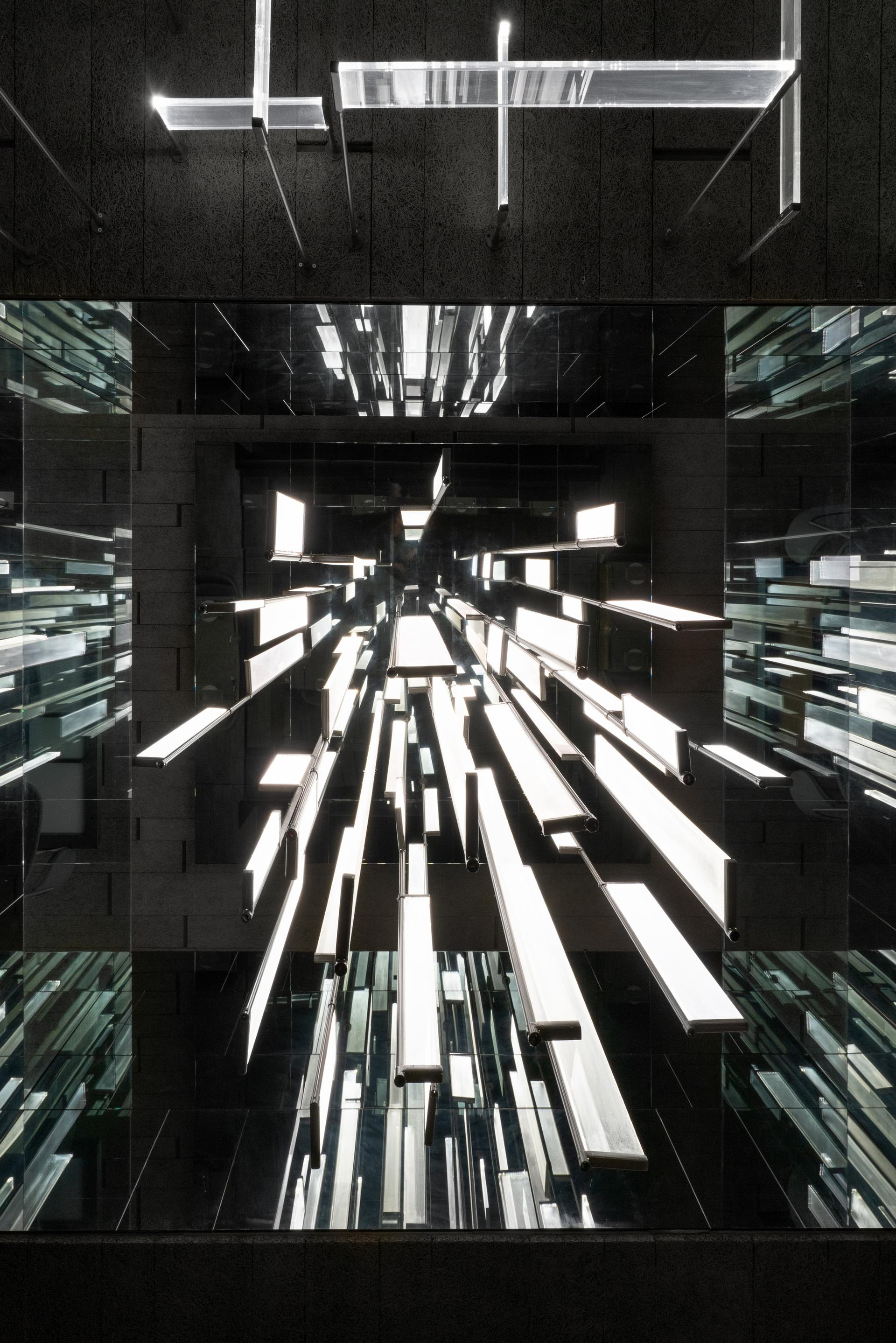 The space is marked by the constant presence of orthogonal luminous signs, which accompany the guest starting from the entrance: from here you proceed towards the rooms in a theatrical atmosphere defined by thin luminous lines integrated into the walls. At the center of the space, an installation inserted in the void obtained between the two levels becomes the protagonist of the rooms: the almost full-height sculpture, made with backlit extra light glass blades, is embraced by mirrors that amplify its perception in every direction.
