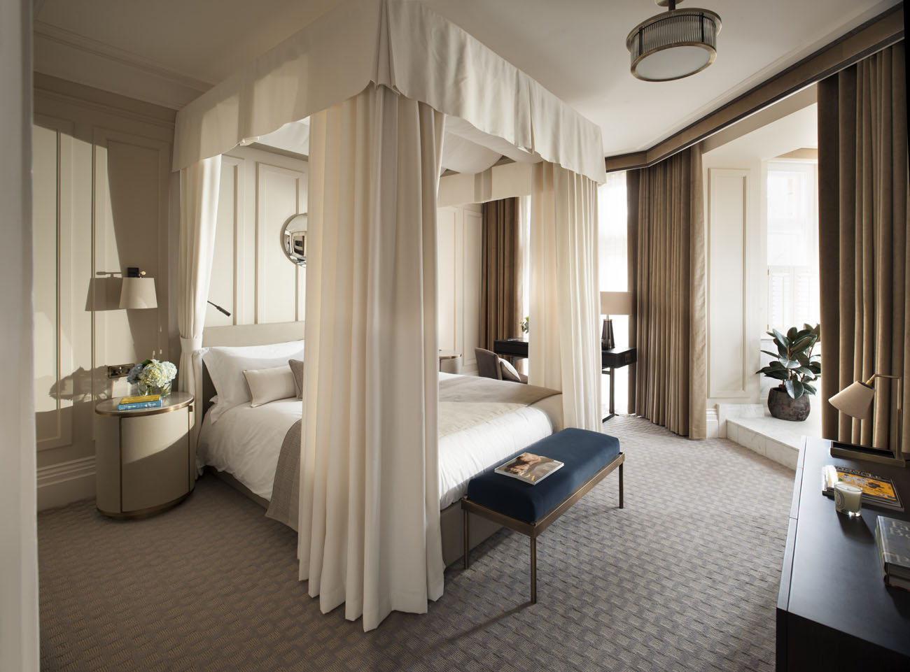 Kimpton Fitzroy London has an interior courtyard, the Palm Court, which provides a peaceful oasis away from the hustle and bustle of central London. Having reinstated some of the building’s original ceiling design with subtle backlighting used to create the illusion of a glass roof, the existing floor plan was re imagined by introducing a walled fireplace and glass crittall doors that lead onto a cocooned, open-air space perfect for intimate gatherings, while the bedroom interiors pay respect to the building’s rich past by ensuring that there is a contemporary-meets-antique aesthetic running throughout. The corridors that connect the guestrooms have tasselled bell-pulls outside each room and Victorian-style showerheads in the bathrooms act as a tribute to the hotel’s history. Maximising the space planning and using classic furniture ensures the interiors compliment their surroundings.