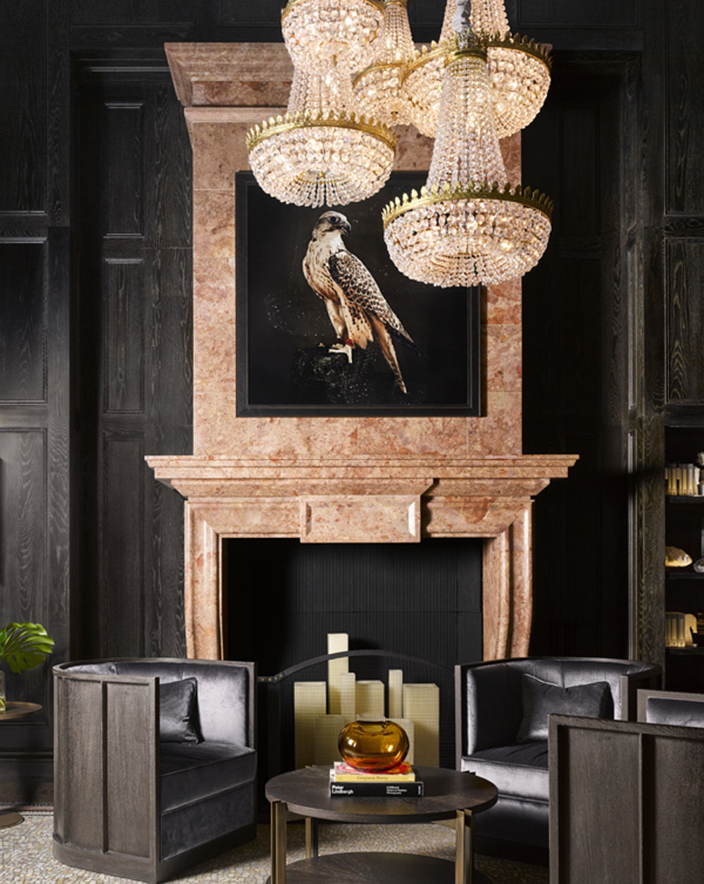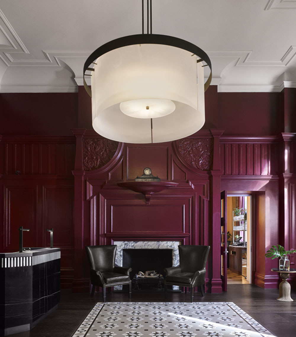 The public spaces of the property feature some of Bernerd’s best work as she blends rich velvets in warm sage and deep navy to create a classic club house feel in the listed marble entrance. Antique brass light fixtures sit seamlessly with mid-century furniture to give a nod to the historic past while meeting the needs and expectations of the modern guest.