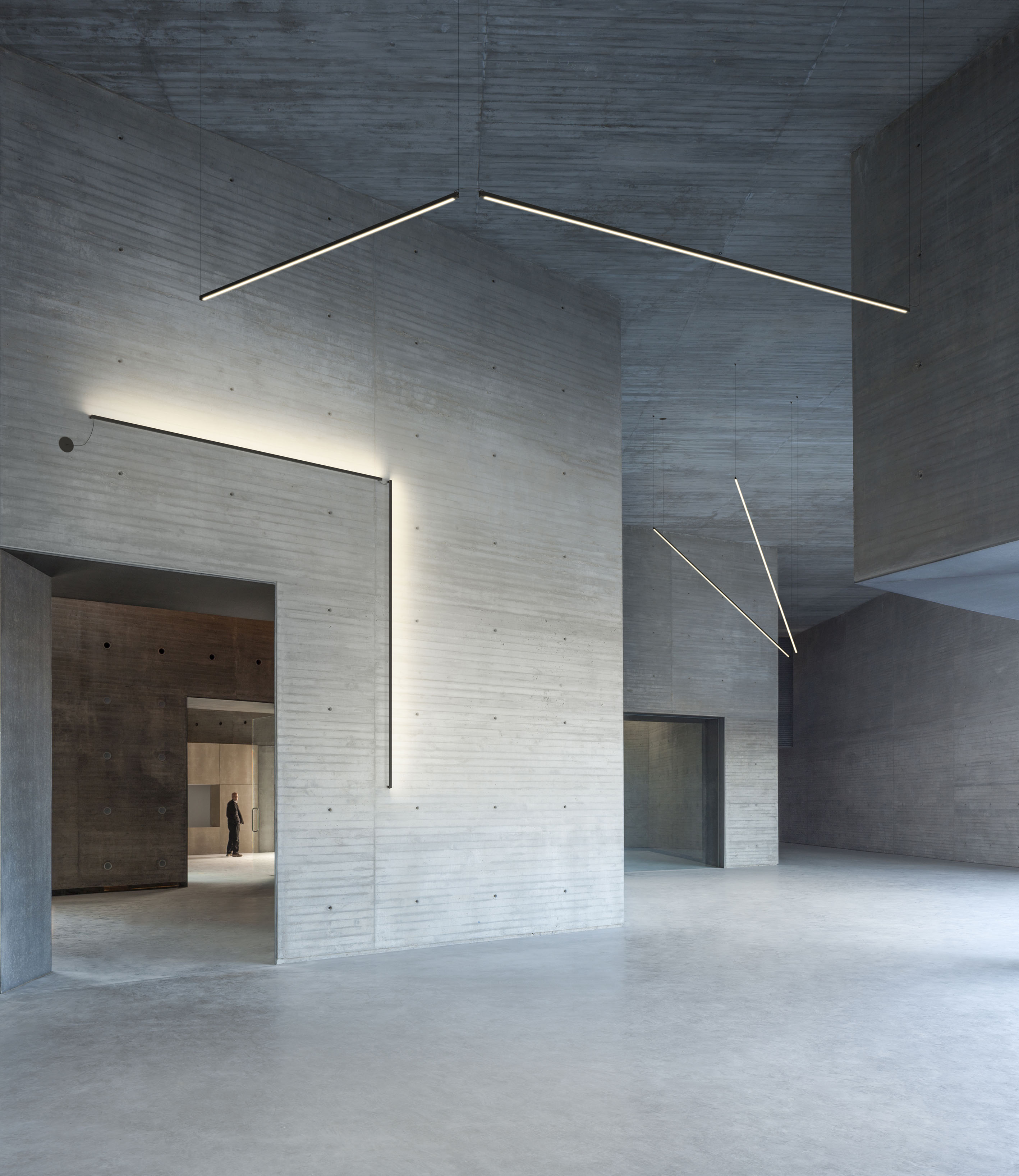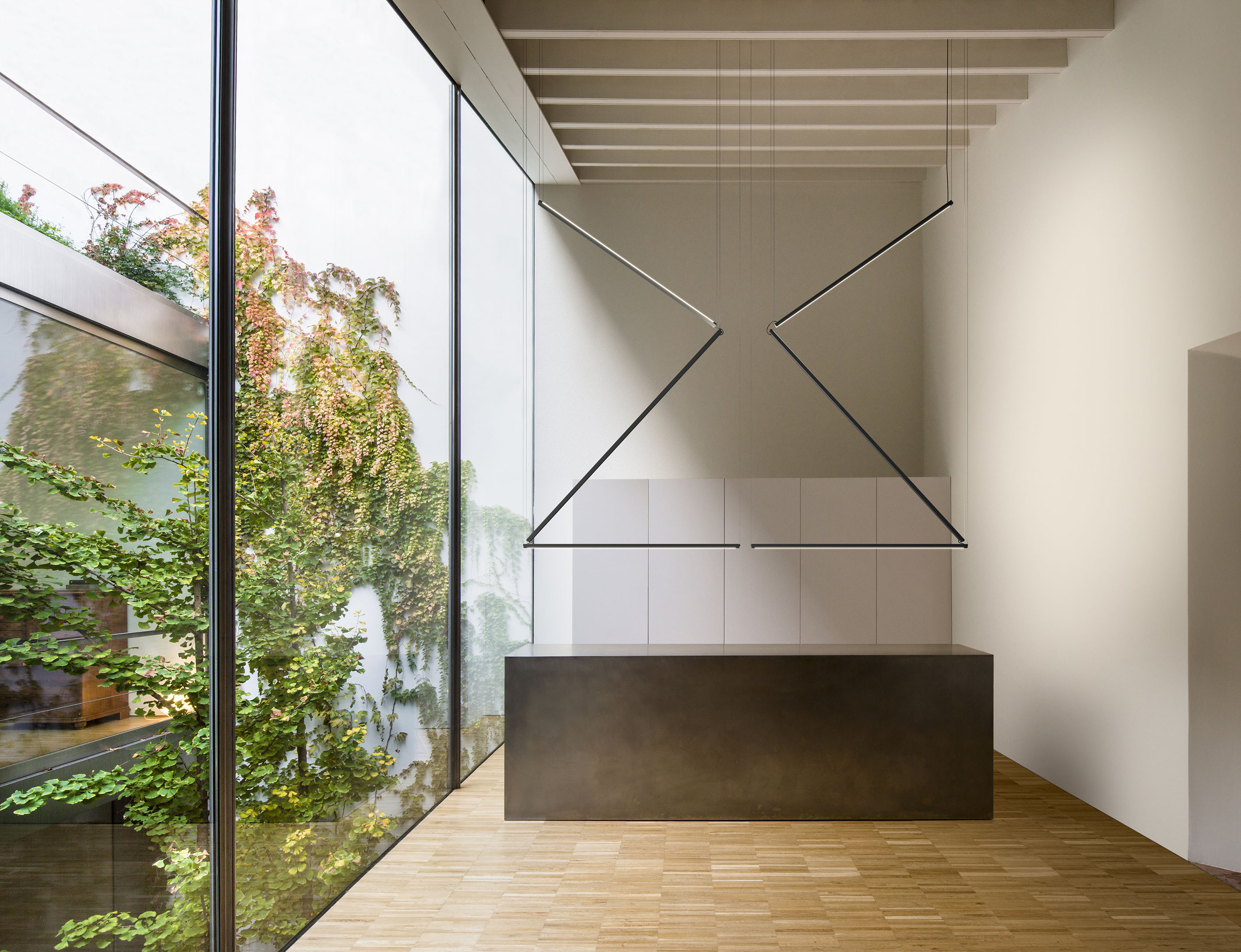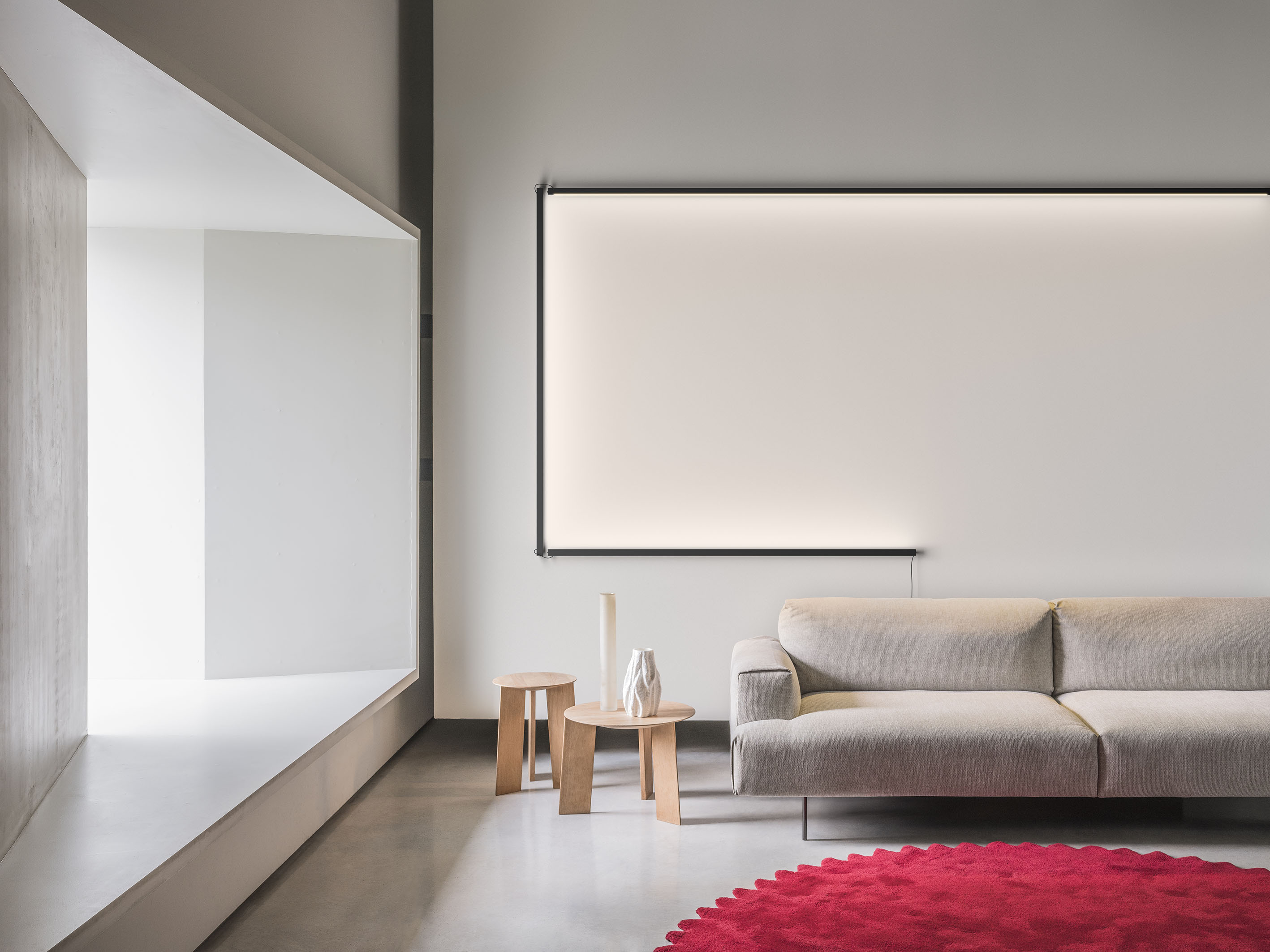 Through its minimalist form and the focused illumination it generates, it creates and disrupts architectural planes, transforming linear light into an abstract art installation.