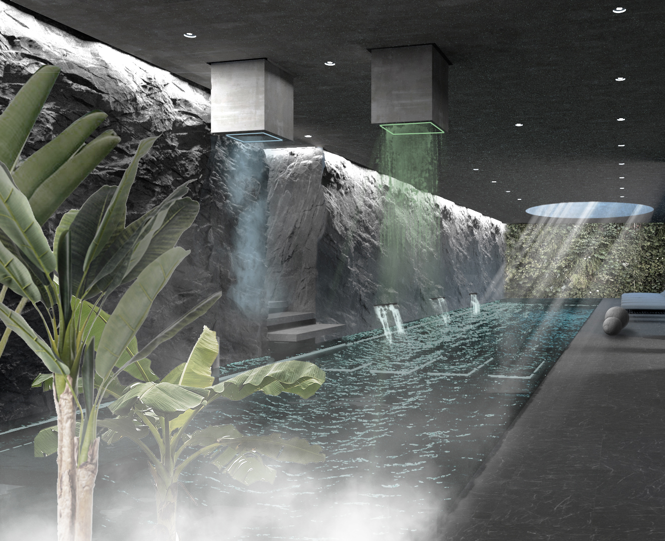 The new spa is 500 square meters of size and it is created as the celebration of the meeting between the majesty of stone and the fluidity of water. The spa will be a space entirely based on the care and well-being of the person with 10 stations: chromo-therapy shower and steam baths, relax area, Turkish bath, hot tub, sauna, swimming pool with counter-current swimming, Kneipp path, salt room and massage room. The hydromassage area will be the center of the project and it is part of a loop of the ground that contained tanks for collecting rainwater. It will be characterized by a pool of water with an elliptical cut in the center, which sculpts an air ring always maintaining the dialogue between nature and architecture.