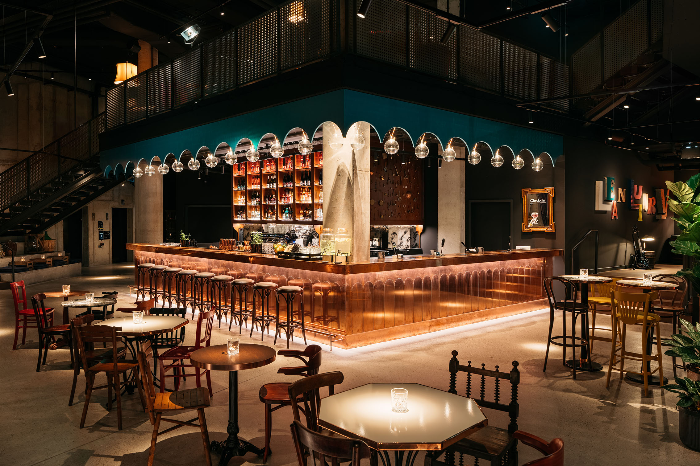 Inspired by alchemy, wine production and distilleries, there is a lot of copper in the design. The absolute highlight is the 24/7 bar - the heart of every Ruby Hotel - which shines completely in polished copper in the Hanna, rounded off by the countless indirectly illuminated filled round flasks above the bar.