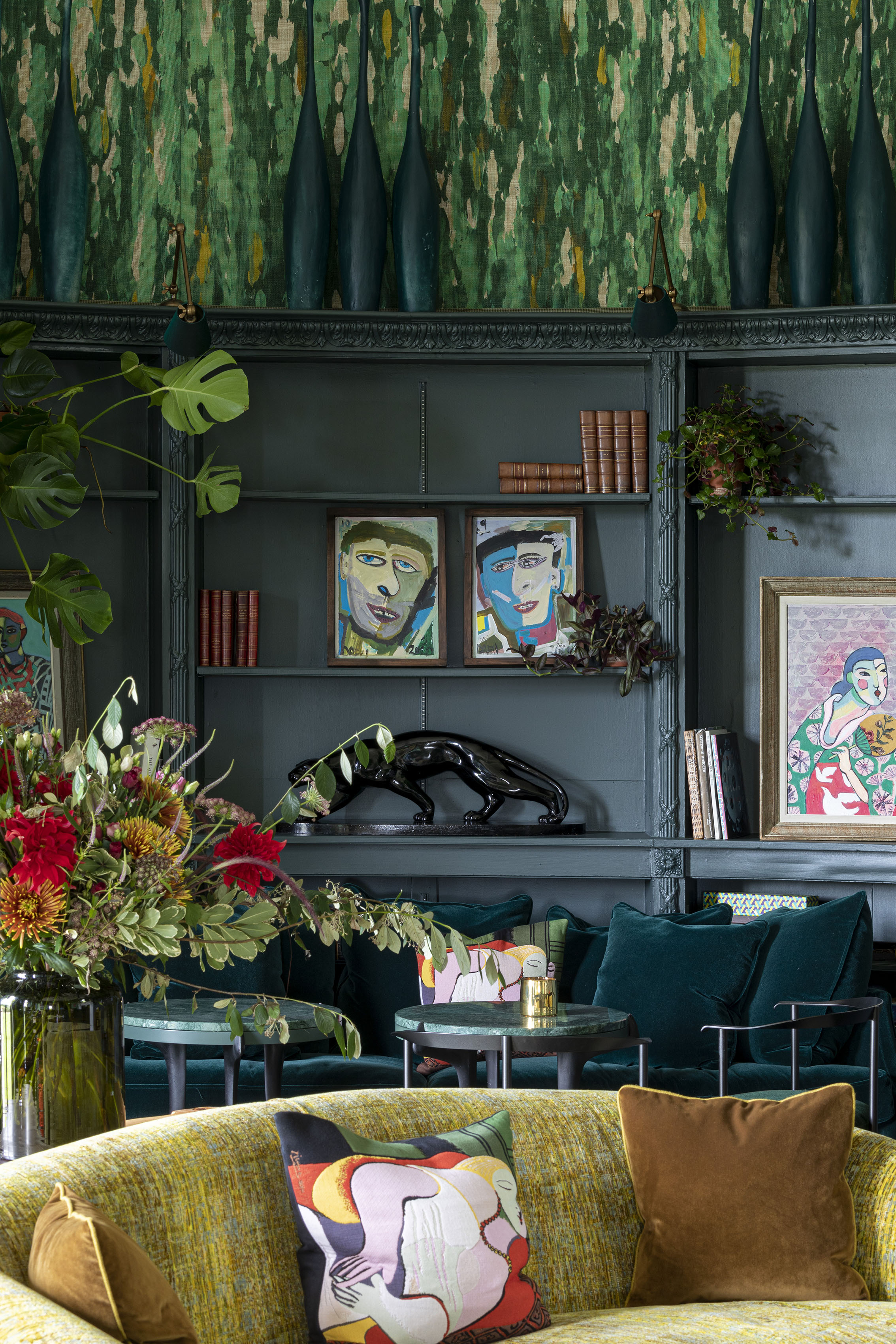 The Library completes the trio of rooms and invites the verdant garden surrounds of The Grove inside, with a scheme of tonal greens and earthy hues. A hand-painted, bespoke fabric covers the walls of the curved, oval space, complemented with dark panelling and contemportary artwork.