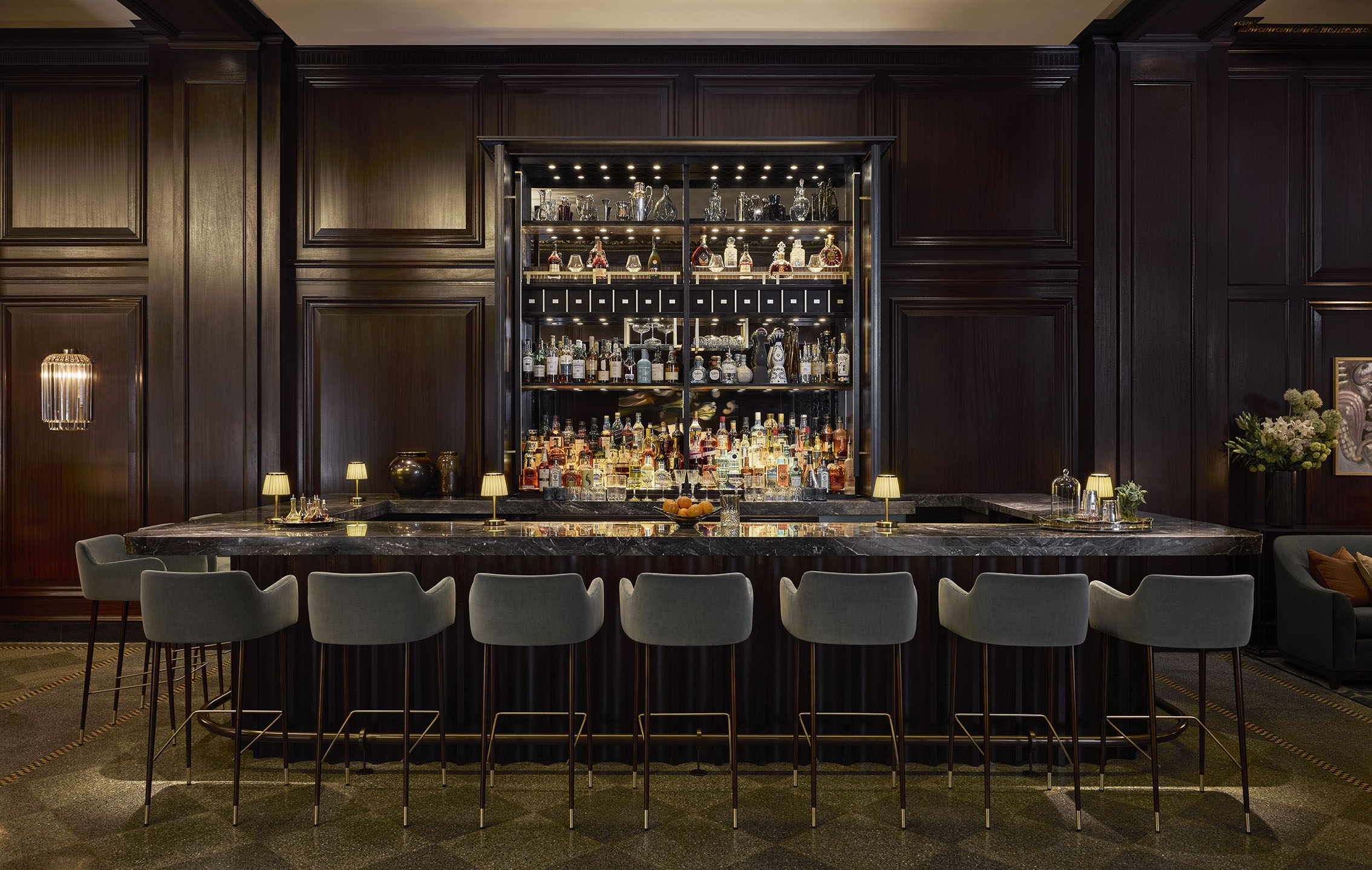 Embodying the spirit of the gilded art deco era, The Georgia Bar is the hotel’s new mixology-focused concept, centered around a dramatic, u-shaped Arabescatto Orobico marble-top bar with a backdrop of stately mahogany-paneled walls and marble checkerboard floors. Cocooning guests are bespoke, custom furnishings produced by artisan makers in Europe outfitted in soft upholsteries of crushed velvets and rich leather, ornate crystal fixtures, unique archival objects, and an eclectic art collection, all infusing the ambiance with both elegance and character.