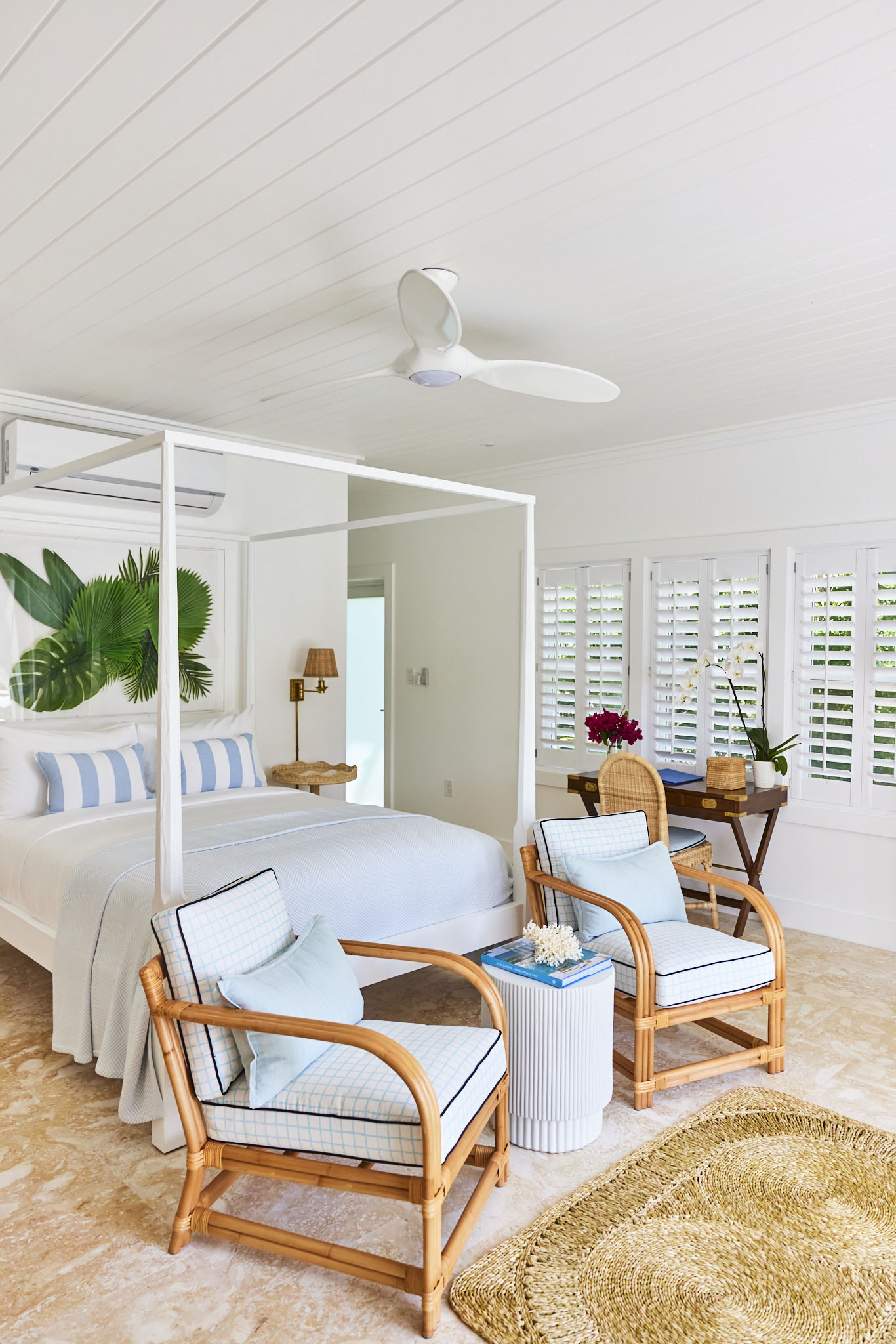 Fronting a seven-mile deserted stretch of pink-sand beach, The Potlatch Club is an oceanfront escape where breezy coastal elegance meets timeless Caribbean architecture at the reborn Potlatch Club. In all, four original buildings were saved and refurbished. The property’s original clubhouse retains historic details, such as checkered floors, which were crafted in Nassau in 1919, and classic whitewashed arches that hark to the property’s storied past, while striped awnings and pops of pastel add glamorous seaside flare. White walls, pink coral stone floors, coral stone finished bathrooms, designer furniture and original art complete the relaxed yet upscale beachy look.