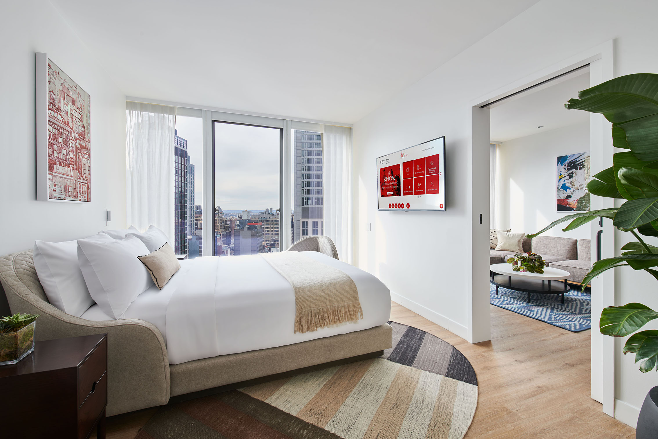 Travellers seeking the most luxurious overnight experience can book a stay in Sir Richard's Flat, an impressive 2,800-square foot suite spanning the hotel's 35th and 36th floors. The expansive duplex offers the pinnacle of urban living, featuring two bedrooms, including a spacious master bedroom; a striking walk-in bathroom with luxe amenities like a rain-head shower and bench, a soaking tub, and a vanity; a kitchenette; 24-foot windows with panoramic views of the city; and a curated art collection within the suite. For all room categories, a guest stay is further enhanced through Virgin Hotels' mobile app Lucy, which enables guests to control lighting and thermostats, request services, stream their own content or browse television programming, and order room services at the touch of a finger.