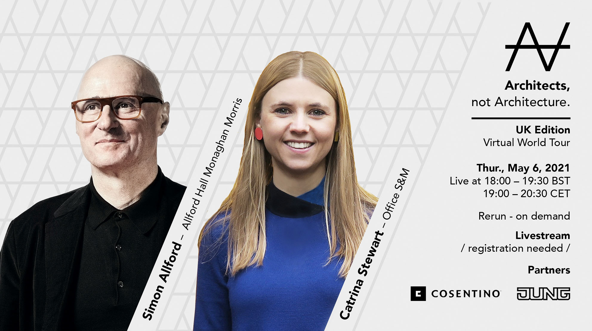 On May 6, 2021, British architects Simon Allford (AHMM and RIBA President 2021-2023) and Catrina Stewart (Studio S&M) will be participating live from London. The event is called "Architects, not Architecture", www.architectsnotarchitecture.com. Here you can find one of the previous virtual events: www.architectsnotarchitecture.com/newyorklive.